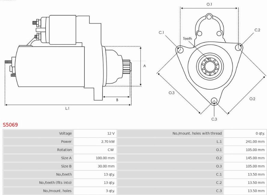 Electromotor MITSUBISHI LANCER VIII (CY_A, CZ_A), Sedan, 03.2007 - AS-PL S5069 POTRIVESTE PE URMATOARELE MODELE: AS-PL S5069 Specificatii tehnice: Tensiune: 12 Numar dinti: 13 Putere electromotor: 2,70 Directia de rot... Read more...