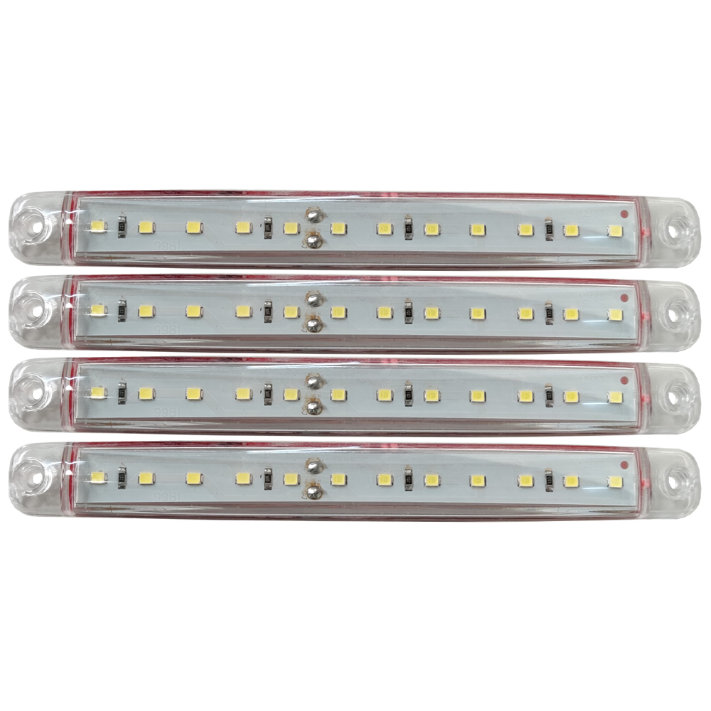 - S10034A CULOAREA: ALB, Descriere: Set de 4 buc lampi gabarit cu 12 LED-uri si lentile de culoare alba., Functioneaza la 12/24V., Fixare cu suruburi (nu sunt incluse in pachet)., Dimensiuni: 172x20x11mm,