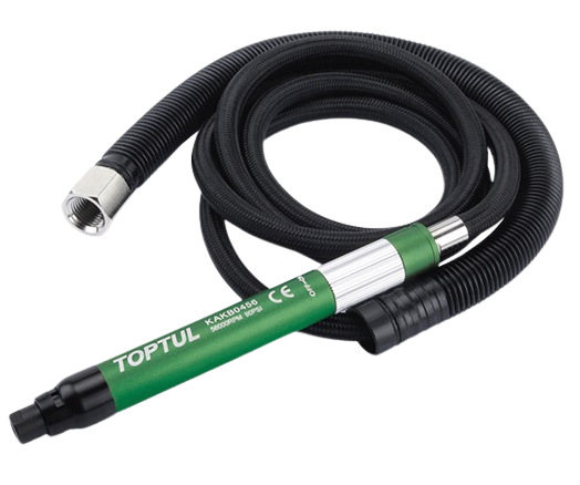 TOPTUL ofera instrumente pentru forta de munca profesionista cu inalta pregatire si ingineri dedicati, care se angajeaza sa satisfaca nevoile clientilor. Sculele noastre sunt foarte apreciate de clienti datorita duratei de viata mai lungi, pretului rezonabil si intretinere mai mica. Cu un management al calitatii bine intretinut care cuprinde o echipa de profesionisti cu experienta, aceste scule au asigurate durabilitatea. Scule din seria KAKB Include doua mandrine: 3 mm (insertie) si 1/8 Regulator de putere reglabil pentru control precis Evacuare spate cu furtun Rulmenti de inalta calitate pentru o functionare lina si puternica Potrivit pentru aplicatii de slefuire, lustruire, lustruire si debavurare Mandrina cu colt - 3 mm / 1/8 Putere - 0,05CP / 0,04 KW Viteza libera - 56000 RPM Presiunea aerului - 90 PSI / 6,2 BAR Consum de aer - 3,5 CFM Intrare aer - 1/4 PT Furtun de aer - 13/64 I.D. Lungime totala - 5-15/32 / 139 mm Greutate neta - 0,44 lbs / 0,2 kg