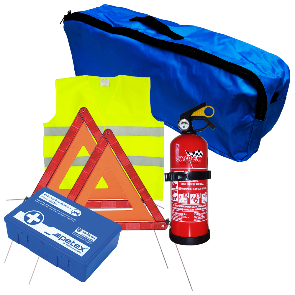 - PROMOCRIB, Descriere: Pachet pentru prim ajutor auto conform legislatiei rutiere din Romania. Produsele au omologare Europeana., Pachetul contine:, - 1buc. Trusa sanitara auto - termen de valabilitate 05.2027, - 1buc. Stingator auto cu pudra ABC tip P1 - termen de valabilitate 5 ani, - 2buc. Triunghi presemnalizare, - 1buc. Vesta reflectorizanta - Galben, - 1buc Geanta organizatoare - Bleumarin,