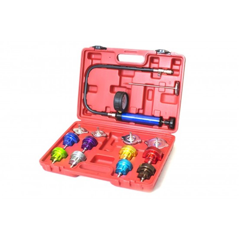 Testerul pentru sisteme de racire cu 17 piese profesionale verifica: etanseitatea instalatiei de racire, termostatul, priza senzorului de temperatura. Aparatul contine o supapa de siguranta, aceasta este fixata in radiator sau in capacul egalizatorului. Potrivit pentru toate motoarele traditionale cu racire cu lichid.
